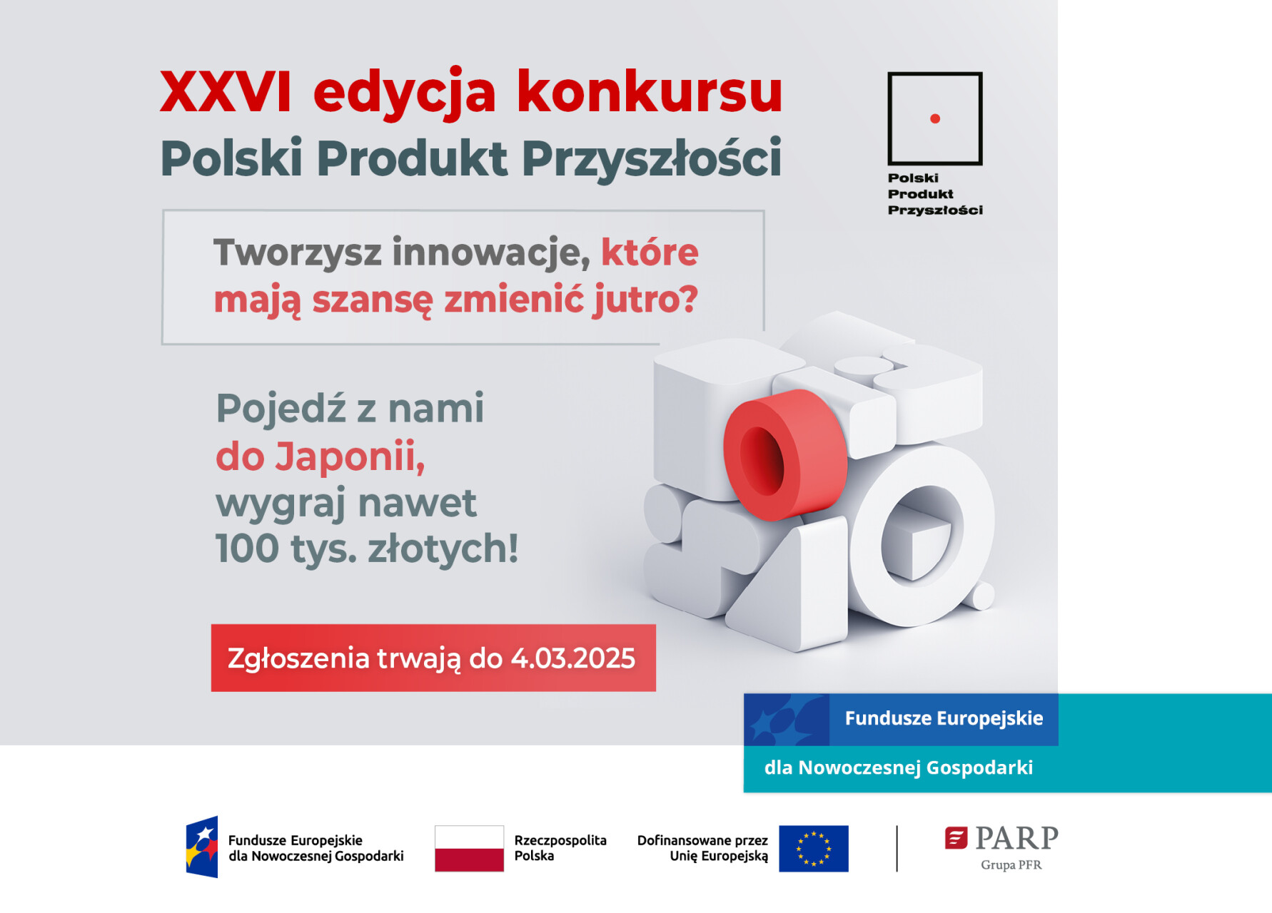 Polska Agencja Rozwoju Przedsiębiorczości (PARP) rozpoczęła XXVI edycję prestiżowego konkursu „Polski Produkt Przyszłości”, który ma na celu wyłonienie najbardziej przełomowych produktów i technologii o istotnym potencjale rynkowym, zarówno krajowym, jak i na rynkach zagranicznych. Zgłoszenia można nadsyłać do 4 marca 2025 roku. Dla zwycięzców w trzech kategoriach przewidziano nagrody finansowe w wysokości 100 tys. zł, a dla wyróżnionych – 25 tys. zł.