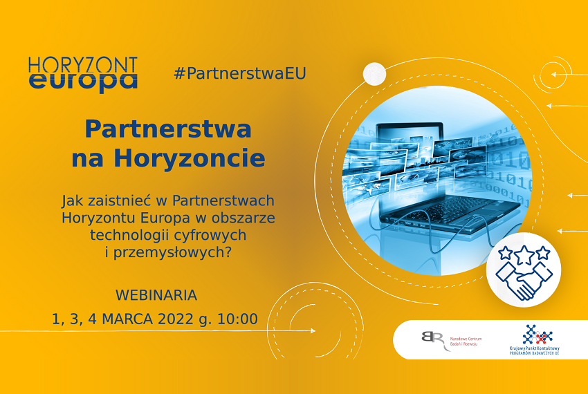 Z przyjemnością informujemy, że w dniach 1 oraz 3 i 4 marca br. eksperci z Sekcji Konkurencyjności Przemysłowej w Dziale Krajowego Punktu Kontaktowego Narodowego Centrum Badań i Rozwoju, organizują cykl spotkań online pt.: Partnerstwa na Horyzoncie, na który serdecznie zapraszamy.