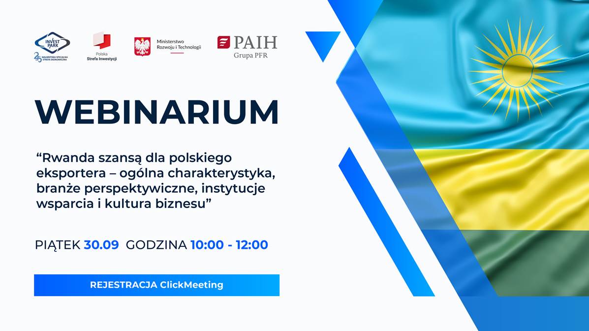 WSSE „INVEST-PARK” Sp. z o.o. w ramach webinariów Strefy Eksportera oraz organizowanej w listopadzie br. misji biznesowej do Rwandy, wspólnie z Zagranicznym Biurem Handlowym PAIH w Kenii, przy wsparciu merytorycznym Departamentu Handlu i Współpracy Międzynarodowej Ministerstwa Rozwoju i Technologii, ma przyjemność zaprosić Państwa na: