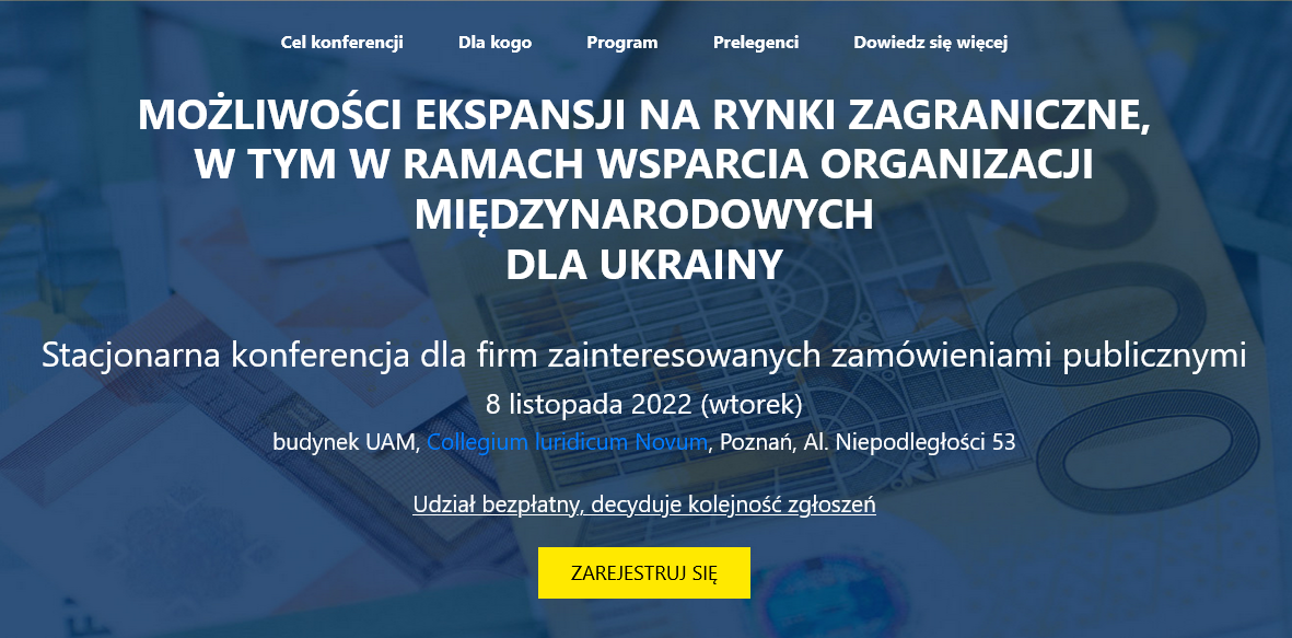 Konferencja skierowana jest do wszystkich osób zainteresowanych zagranicznymi zamówieniami, a przede wszystkim do firm, które na zagranicznych rynkach szukają swojej szansy na rozwój i ekspansję. Konferencja jest również dla wszystkich, którym tak jak organizatorom, zależy na wsparciu Ukrainy. Międy innymi dlatego w trakcie konferencji będziemy mówić o tym, w jaki sposób organizacje międzynarodowe angażują się w pomoc temu krajowi, a także zbierać dobrowolne środki na pomoc dla Ukrainy za pośrednictwem Fundacji „Kaganek”.