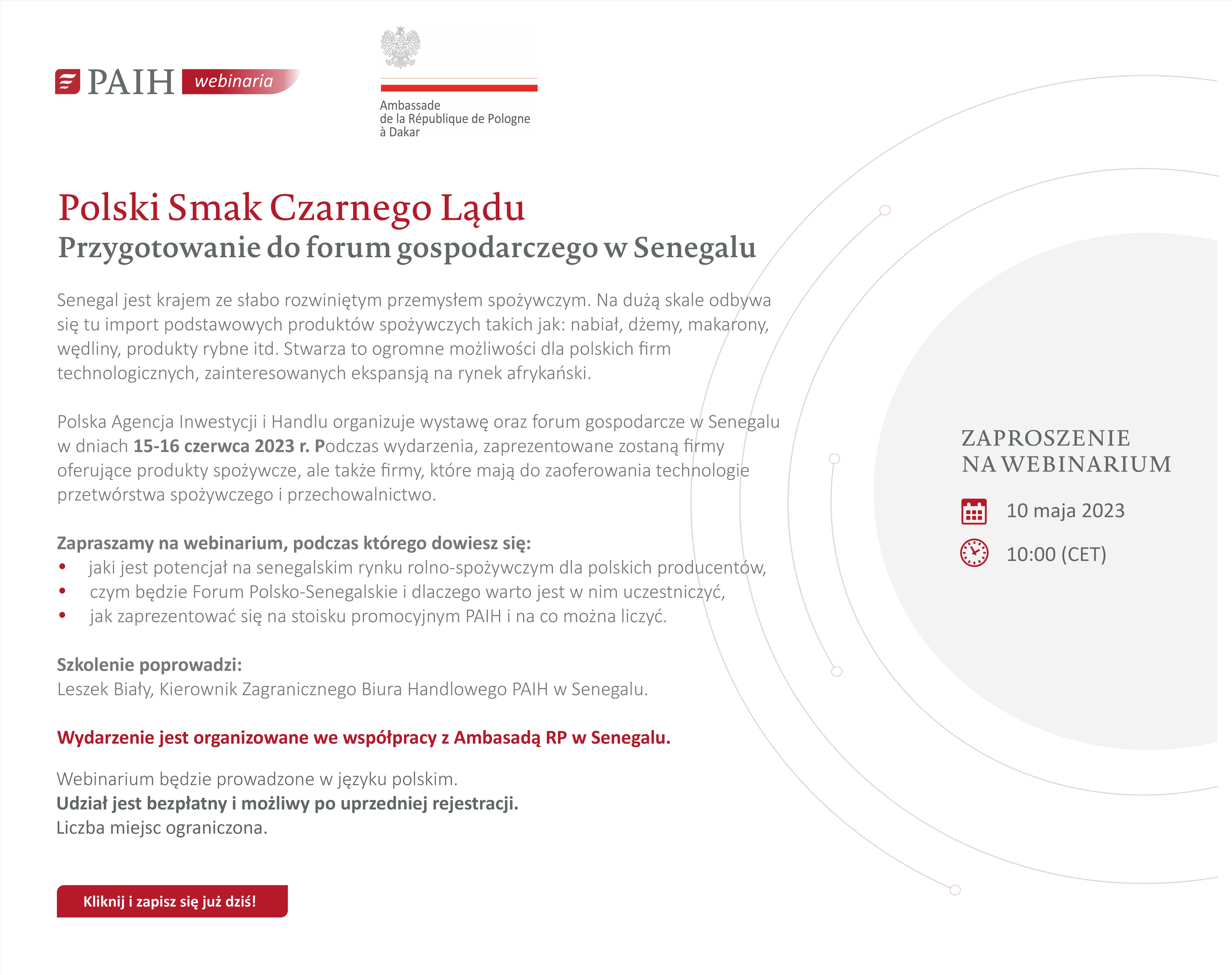 Polska Agencja Inwestycji i Handlu organizuje wystawę oraz forum gospodarcze w Senegalu w dniach 15-16 czerwca 2023 r. Podczas wydarzenia, zaprezentowane zostaną firmy oferujące produkty spożywcze, ale także firmy, które mają do zaoferowania technologie przetwórstwa spożywczego i przechowalnictwo.