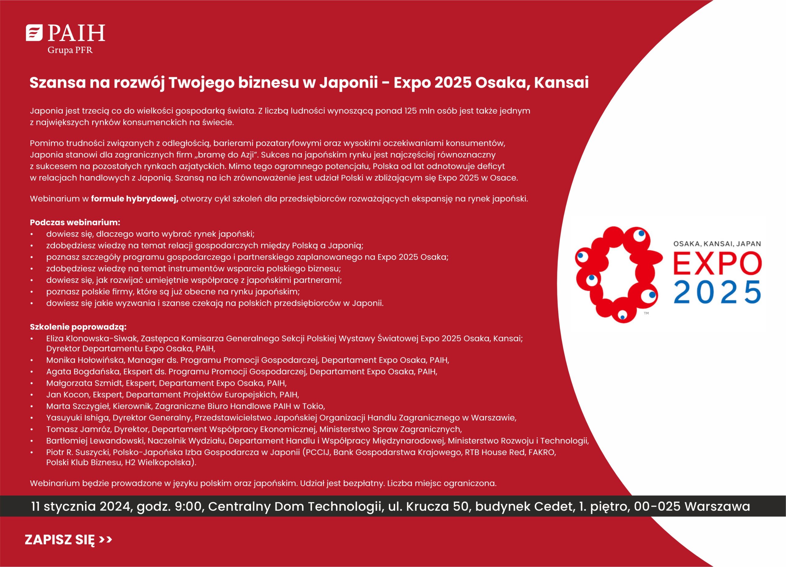 Zapraszamy polskich przedsiębiorców do wzięcia udziału w seminarium hybrydowym „Szansa na rozwój Twojego biznesu w Japonii – Expo Osaka 2025, Kansai”, które odbędzie się 11 stycznia 2024 roku o godzinie 9:00 polskiego czasu (CET), w Centralnym Domu Technologii, 1 piętro, ul. Krucza 50, Warszawa.