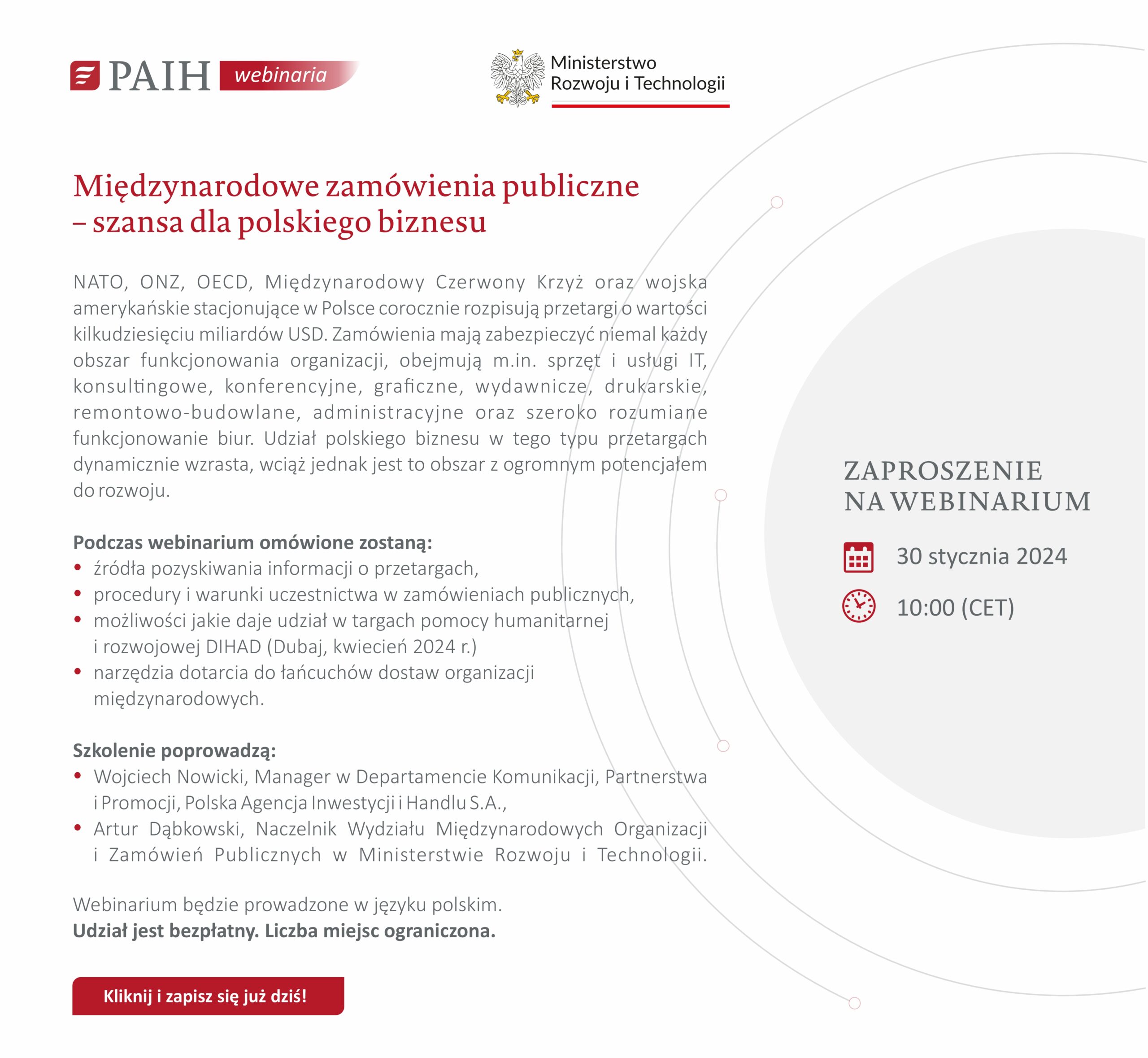 NATO, ONZ, OECD, Międzynarodowy Czerwony Krzyż oraz wojska amerykańskie stacjonujące w Polsce corocznie rozpisują przetargi o wartości kilkudziesięciu miliardów USD. Zamówienia mają zabezpieczyć niemal każdy obszar funkcjonowania organizacji, obejmują m.in. sprzęt i usługi IT, konsultingowe, konferencyjne, graficzne, wydawnicze, drukarskie, remontowo-budowlane, administracyjne oraz szeroko rozumiane funkcjonowanie biur. Udział polskiego biznesu w tego typu przetargach dynamicznie wzrasta, wciąż jednak jest to obszar z ogromnym potencjałem do rozwoju.