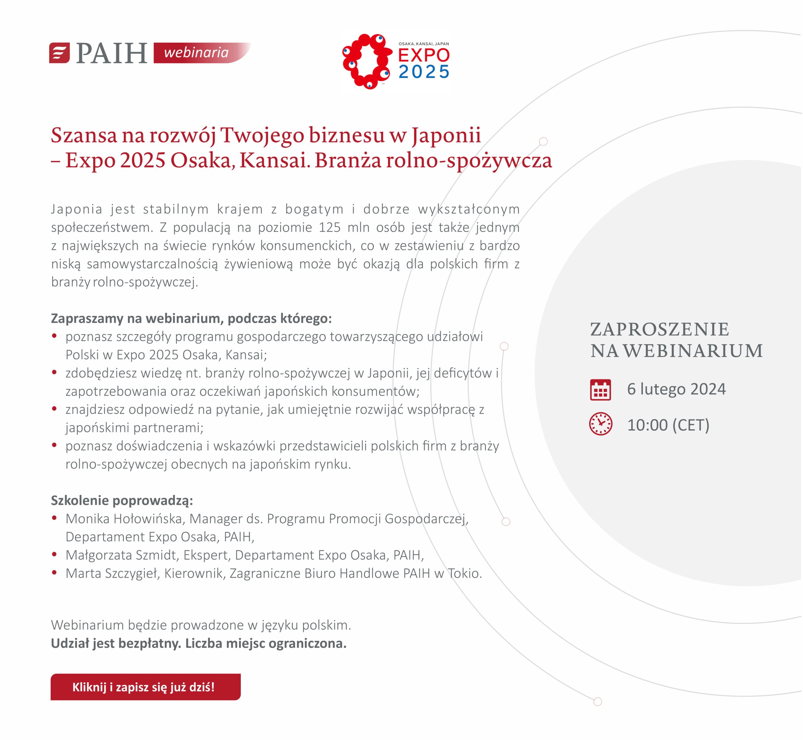 Zapraszamy polskich przedsiębiorców do wzięcia udziału w webinarium, które odbędzie się 6 lutego 2024 roku o godzinie 10:00 polskiego czasu (CET).